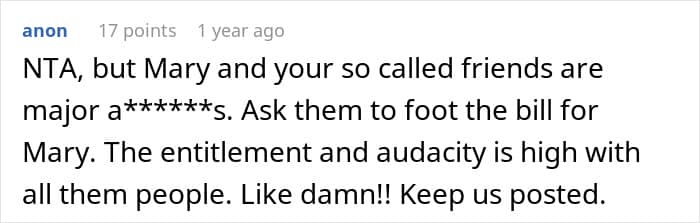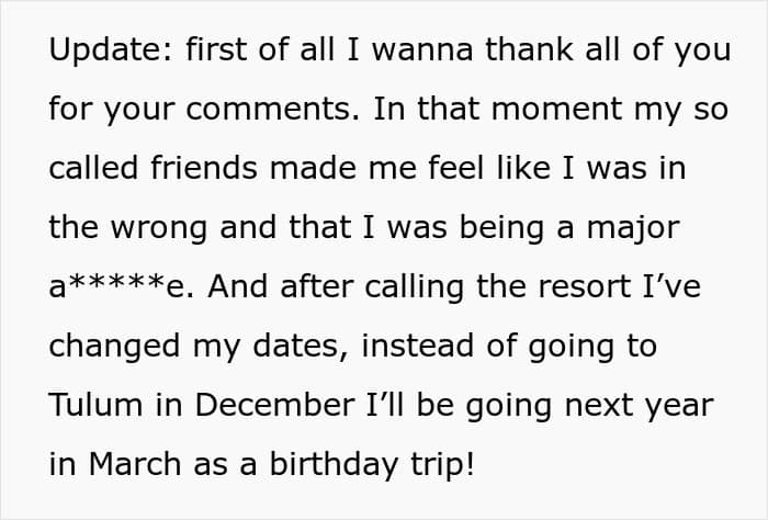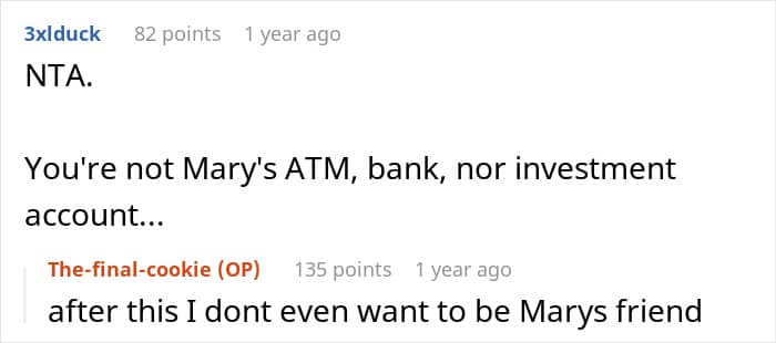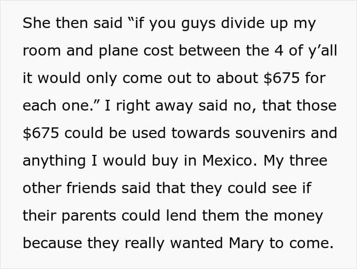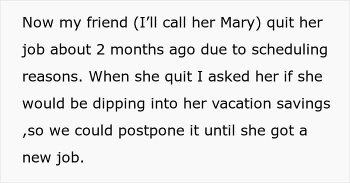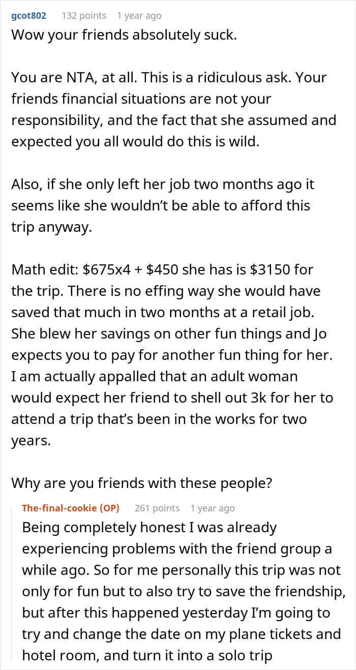 Like this woman who was asked to cover her friend’s travel expenses for a group vacation. The friend, who recently lost her job, did a poor job of managing her finances and had to rely on her friends to help pay for the trip. However, the author didn’t believe she was obligated to do so and was called selfish by the rest of the friend group. Wanting to find out whether her not covering her friend’s vacation expenses was a jerk move, she decided to consult with the Internet.