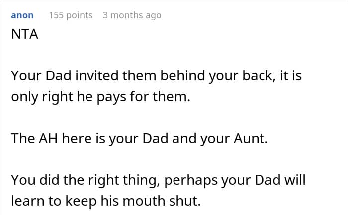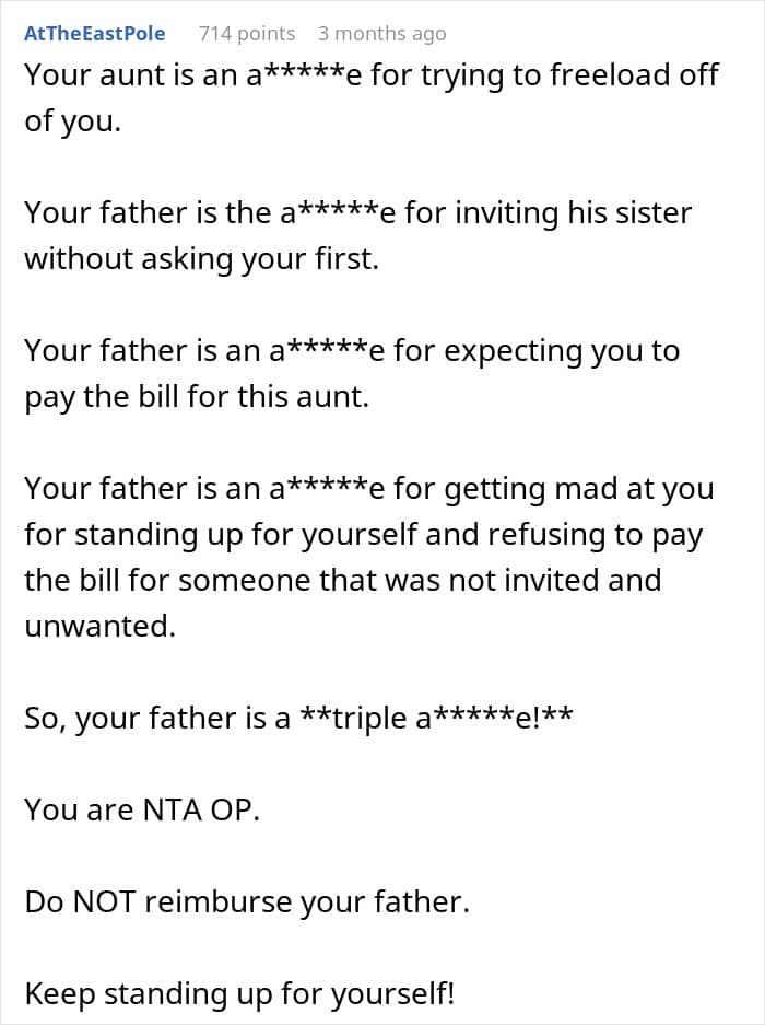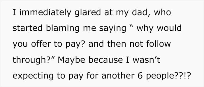 It turns out, the OP’s father had invited his sister and five of her kids to join without letting the host—the OP—know. That put the latter into quite an awkward position in regards to who was going to be covering the bill, but the OP made it clear that it wasn’t going to be them.