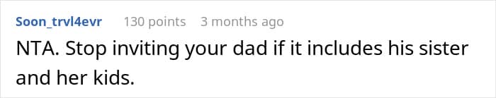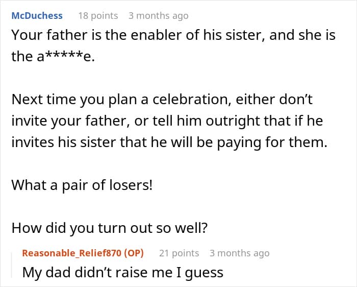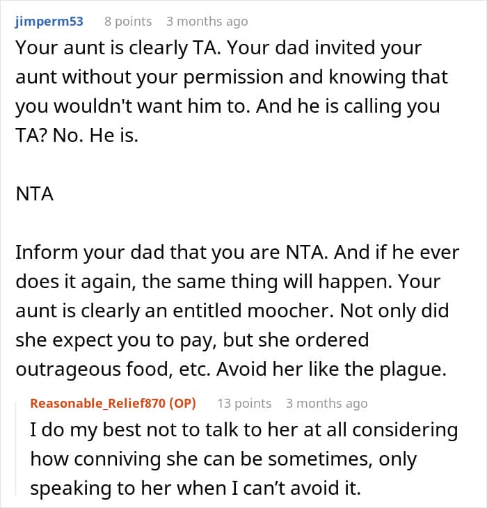 The research also found that it’s the younger ones who were angered by freeloading the most, and that kids become more tolerant of freeloaders with age. Be that as it may, such behavior is not something most would welcome at any stage of their lives. That’s likely why quite a few redditors in the comments criticized not only the father who put the OP in such an uncomfortable situation, but the aunt as well.