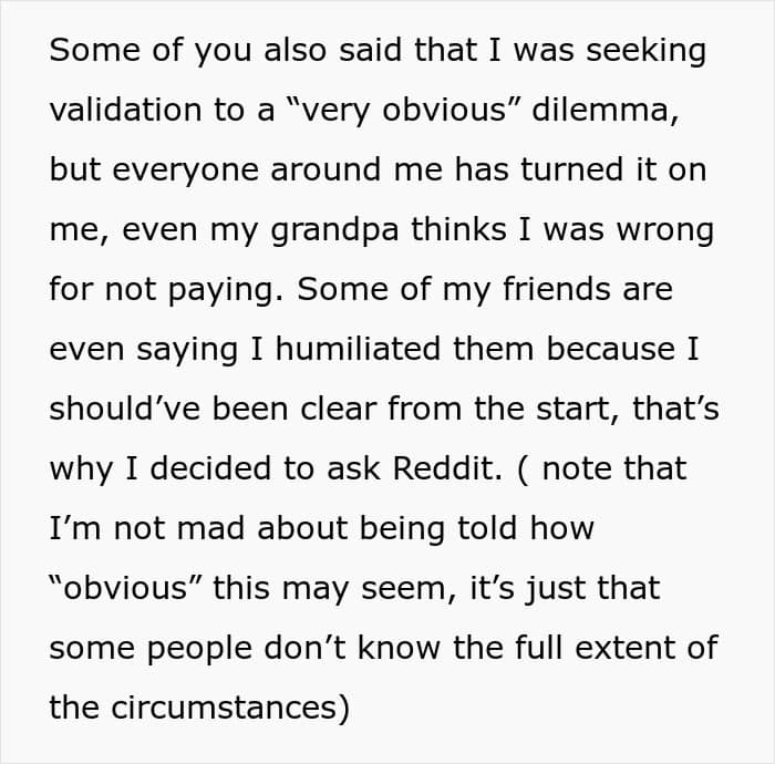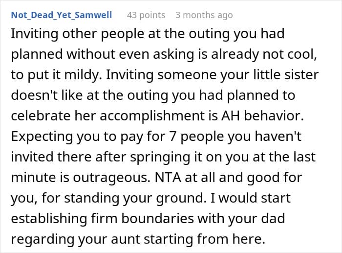 “I felt the most upset by my dad for expecting me to pay for all of my aunt’s kids and then demanding it. It felt a little disrespectful to be put on the spot like that only because I offered to pay for everyone in my immediate family,” the OP told We, expanding on what frustrated them the most about the situation.