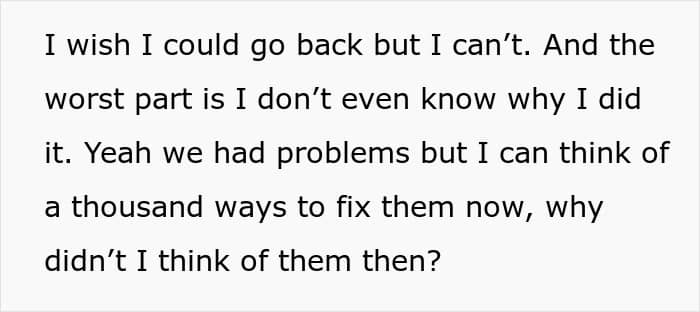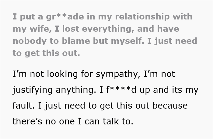 By then, it was too late, though. OP’s wife served him divorce papers he admits he has no right to fight. Now he’s stuck with nothing but memories of a better life.