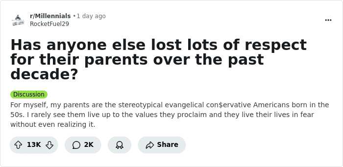 Parents and kids often clash on sensitive issues like politics, religion, their beliefs, and values. As many of the folks in this list shared, having such disagreements with their parents is exactly what pushed them to lose respect for them. Moms and dads might also feel this way, and wonder why their kids are out to cause so much trouble for them.
