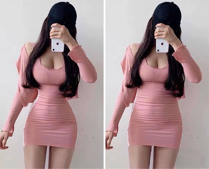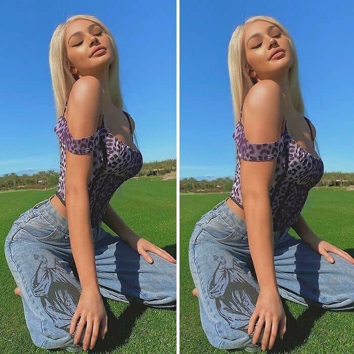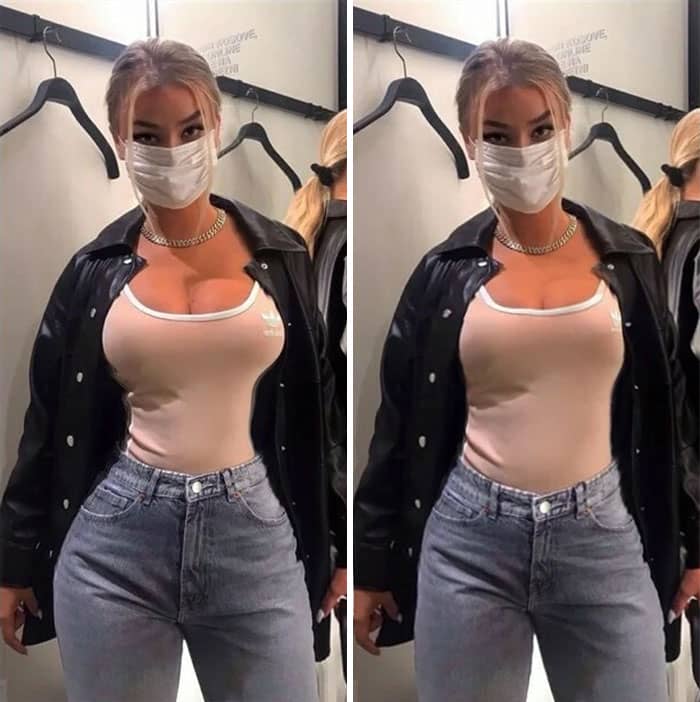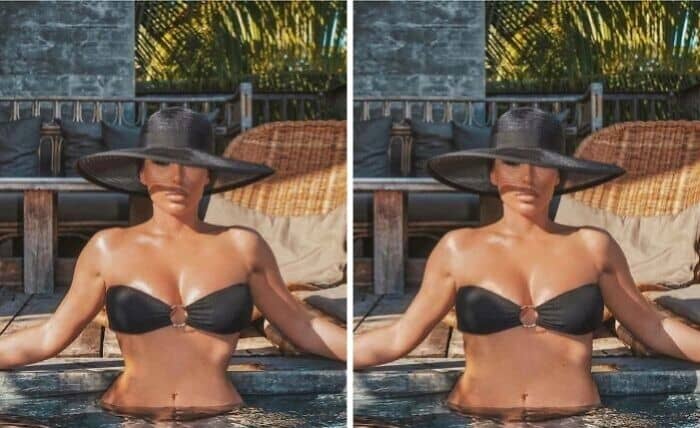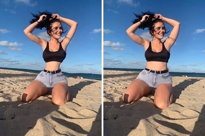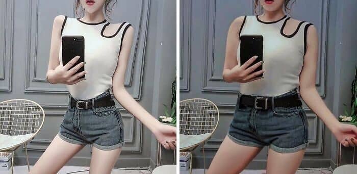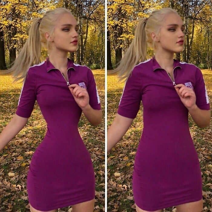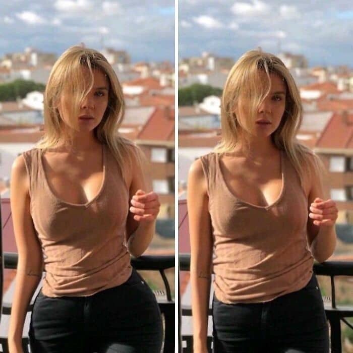 Slimming and body-shaping tools compress or stretch areas of an image, but will warp straight lines in the process. Lamp posts get subtly warped, door frames curve outward, and tile floors appear as if they’re wobbling. Check edges parallel to the frame of the photo, walls, floors, tables, carefully and see if they’re still straight. Any wiggle is a tip-off that the “liquify” or warp tool has been used on the subject.