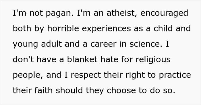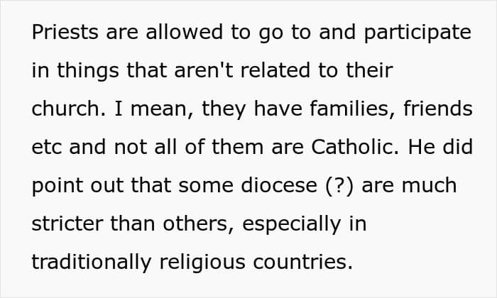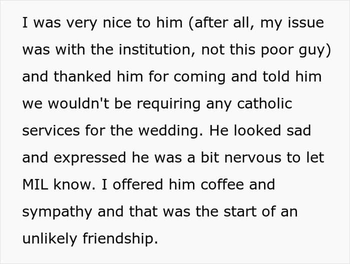 Well, two days later, the “blasphemy” was detected and a priest popped up at their door. Turns out, MIL was having none of their atheistic decisions and was already pushing an agenda on them. That wasn’t an issue, though, as OP was nice about it, explained the situation, and it actually went better than one would assume—it became an unlikely friendship. But more on that later.
