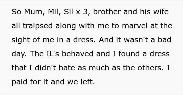 Well, fast forward a year later, OP and pretty much the entire family went dress shopping. After picking out the least of all evils (OP’s not too fond of dresses), she picked out the one and bought it… only to later get a call from the store with an interesting piece of information—the mother-in-law as well as three of her sisters-in-law also bought the same dress. What were they up to?…