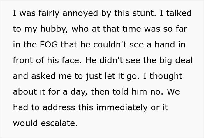 This prompted a confrontation. One that OP had to persuade her hubby about as it was his beloved side of the family, and one that led to some shouting, but one that ended comparatively well as there was “frosty civility” now.