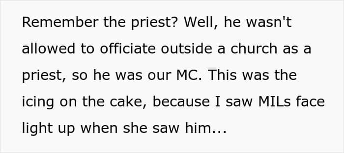 OP’s brother was the maid of honor (yes, you read that correctly), and his wife was OP’s husband’s best man (again, you read that correctly). Oh, and the priest? He was the MC.