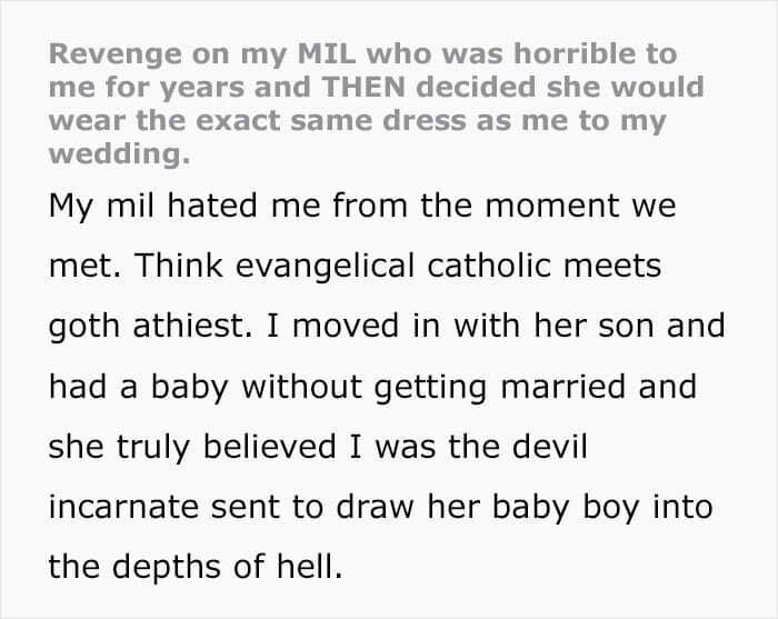 And it doesn’t end here. For one, OP still puts on that dress if she knows MIL will be at the same event—she’s just that petty. But also, the long story got updated with more context from OP in response to people’s questions and comments. Things like not being from the US, specifying her beliefs, what priesthood is, that the original dress cost $300, among other things.