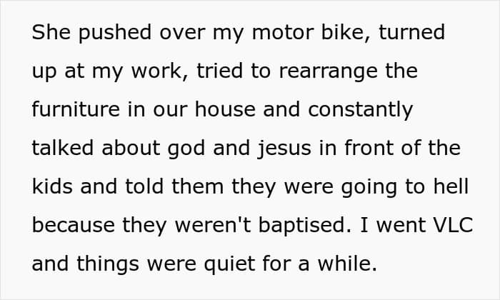 Not only was all of MIL’s continuous microaggression a problem, OP also pointed out that she’d been religiously traumatized, which did not help with a zealot in the family, and it also felt like MIL was sometimes deliberately sabotaging things.