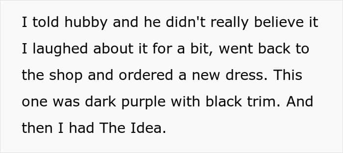 Without hesitation, OP went back to the dress store and got a different one—a dark purple affair with a black trim—all while heavy metal revenge music played in the background. Not really, but you can imagine the scene. This was the point when she also got The Idea.