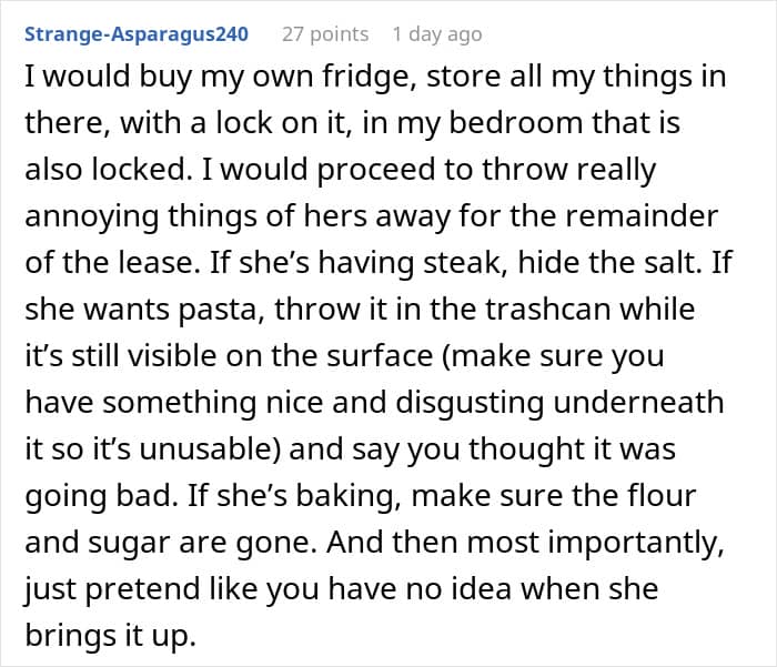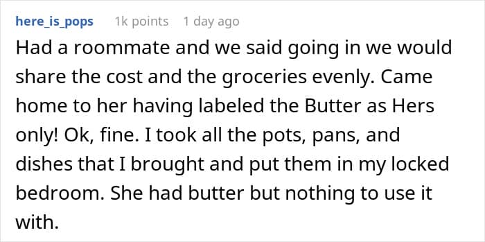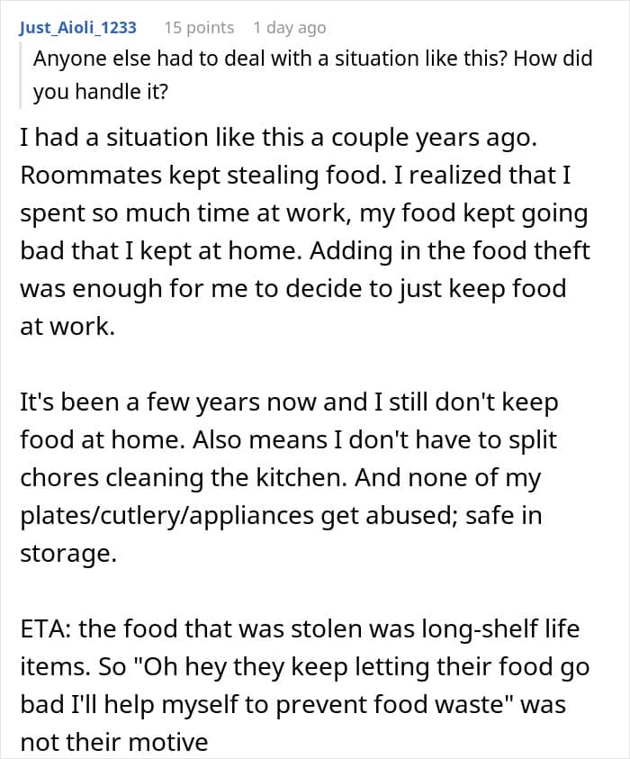 Living with a roommate can be a great way to share expenses and create a comfortable home environment, but when it comes to food, things can sometimes get a little tricky. While this story does showcase one very solid way to deal with people like this, the truth is it’s often best to take more measured steps. Preventing food theft doesn’t have to be confrontational, it often starts with clear communication and a few practical strategies that respect everyone’s boundaries and property.