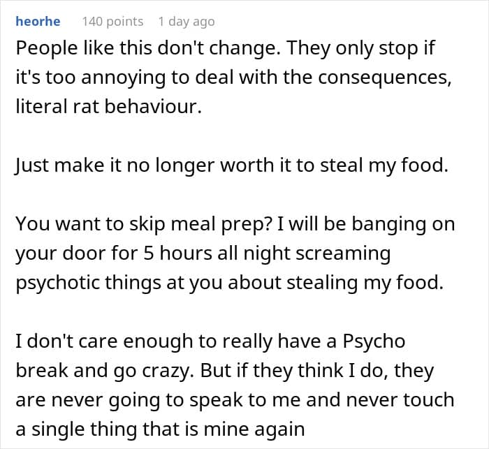 If food theft continues despite these efforts, addressing it directly but respectfully is key. Explain your concerns without assigning blame, and work together to find a solution that keeps the peace and ensures everyone’s needs are met. Often, a calm discussion and mutual understanding can resolve the issue much more effectively than passive-aggressive notes or hidden stashes. If that doesn’t work, it is perhaps a good idea to consider moving. Someone this unreasonable about food will be unreasonable about other things. At the very least, one can invest in anti-theft devices.