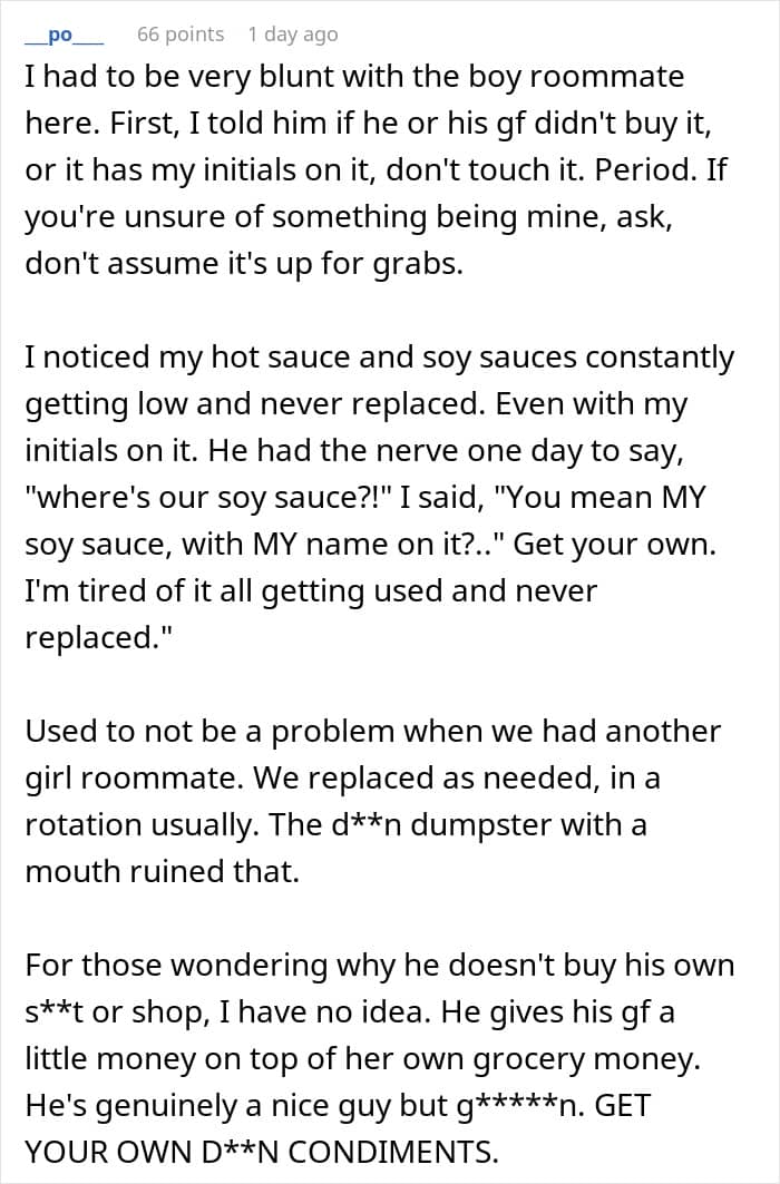 Another practical step is to manage your food inventory regularly. Keeping a list of your items, checking expiration dates, and planning meals can help minimize waste and make it clear what belongs to you. When your roommate sees that you’re organized and intentional about your purchases, they’re less likely to assume that grabbing something off your shelf is acceptable. At the very least, you can say you tried. Unfortunately, some folks just have no concept of sharing costs.