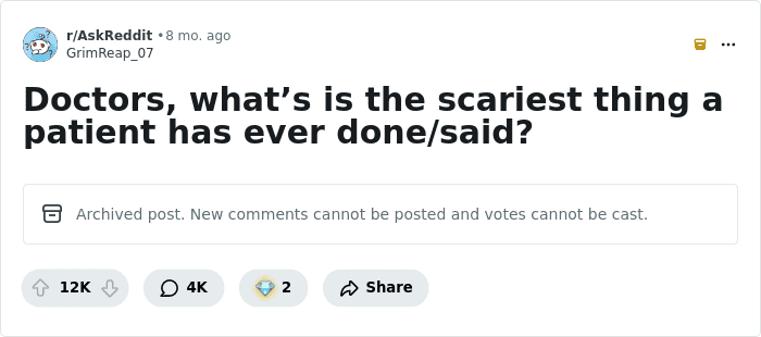 I’m not a doctor but my partner is. Naturally, she always shares her best “war” stories with me. This is one that stands out as particularly freaky/shocking/unsettling.