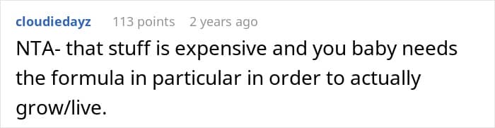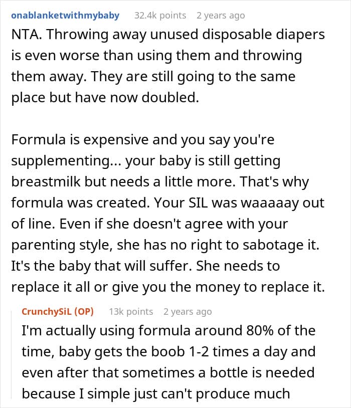 In addition to throwing away something that did not belong to her, which is already something one might frown upon, the SIL got rid of things that were crucial to the baby’s well-being, such as formula, which the OP seemingly used due to low milk supply. When asked to replace all the things she dumped, the SIL said she couldn’t afford to, since, as many parents know, formula is quite expensive. That was one of the reasons why fellow netizens sided with the OP and said she was in no way a jerk in the situation.