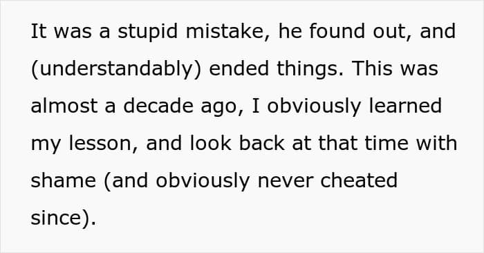 This story is complicated, as it’s quite easy to see both sides of the story. In the woman’s case, yes, she should not have cheated, but high-school relationships, particularly short ones, are often tenuous. Similarly, even if there were no mitigating circumstances, this was almost a decade ago, people do change.