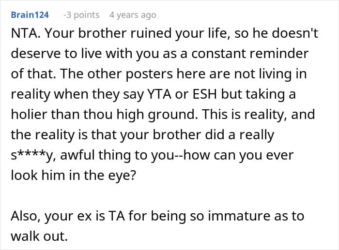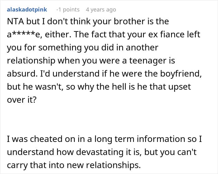 So the woman’s past actions are not necessarily “unforgivable,” but, equally, Hunter might have good reasons for why he can’t move forward with this relationship. However, the crux of the story isn’t actually the past cheating, but her kicking out her brother. In his defense, what he said was dumb, but, equally, how could he have known that this would be such an issue?