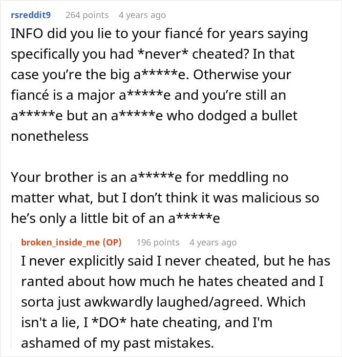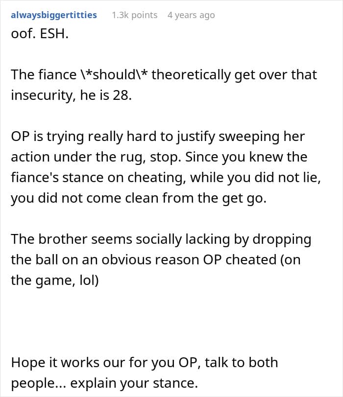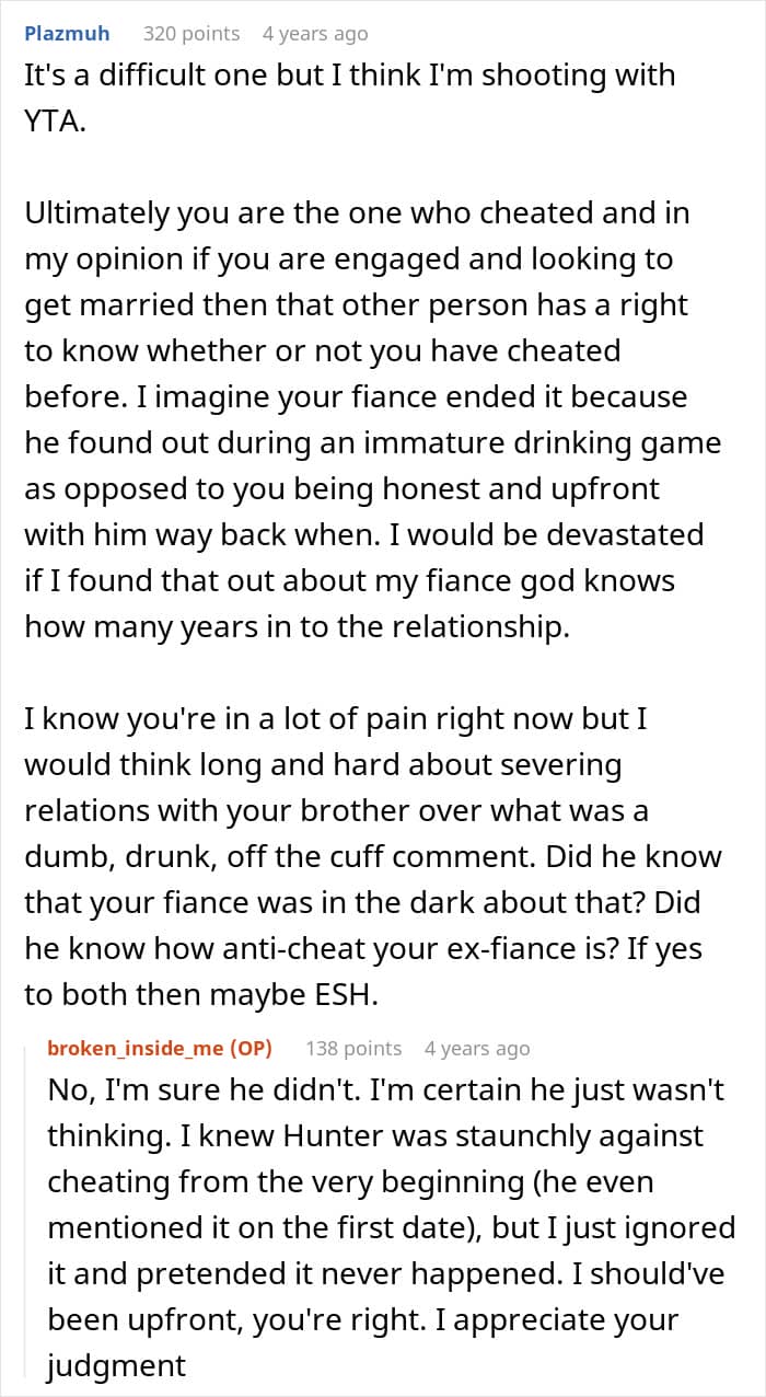 After all, the brother didn’t mention any instances of cheating, so this does not appear to be something this woman does all the time. That being said, it is telling that she hasn’t told the man she intends to marry. As much as “Hunter” might, understandably, dislike cheating, it’s also possible that this reaction was the result of him realizing that the woman was hiding things from him.