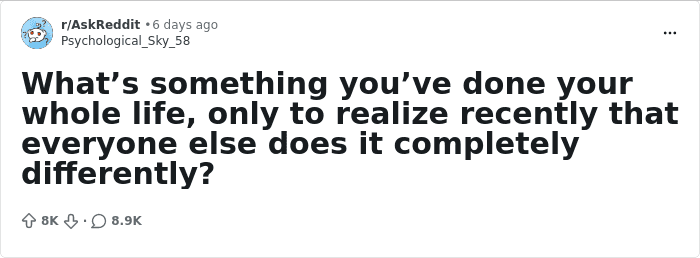 A few days ago, a thread appeared on AskReddit, the author of which, the user u/Psychological_Sky_58, asked netizens: “What’s something you’ve done your whole life, only to realize recently that everyone else does it completely differently?” The result was over 8K upvotes and almost 9K various comments, with stories about literally everything under the sun.