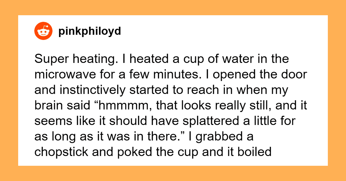 A few years ago I heated a cup of water in the microwave for a few minutes. I opened the door and instinctively started to reach in (with an oven mitt) when my brain said “hmmmm, that looks really still, and it seems like it should have splattered a little for as long as it was in there. I wonder…”