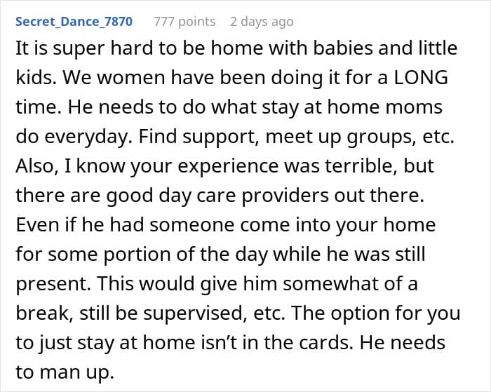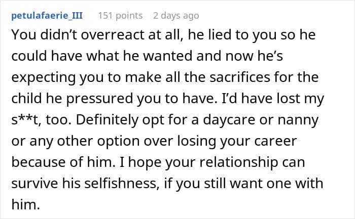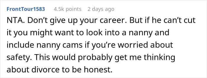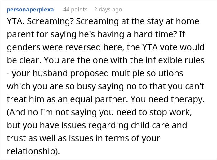 Internet user u/Obvious-Mistake-7801, a new mom and neurologist, asked the internet for advice after a huge argument at home. She shared how she lashed out at her husband after he suggested going back on his promise to be a stay-at-home dad. Scroll down to read the full story and to see how the r/AITAH community interpreted the situation. We has reached out to the author, and we’ll update the article as soon as we hear back from her.