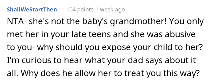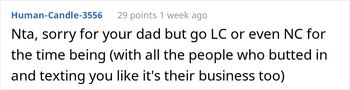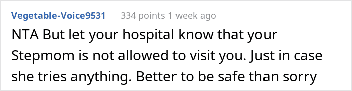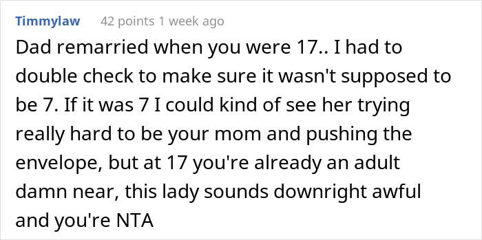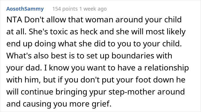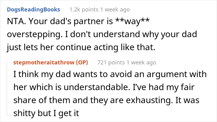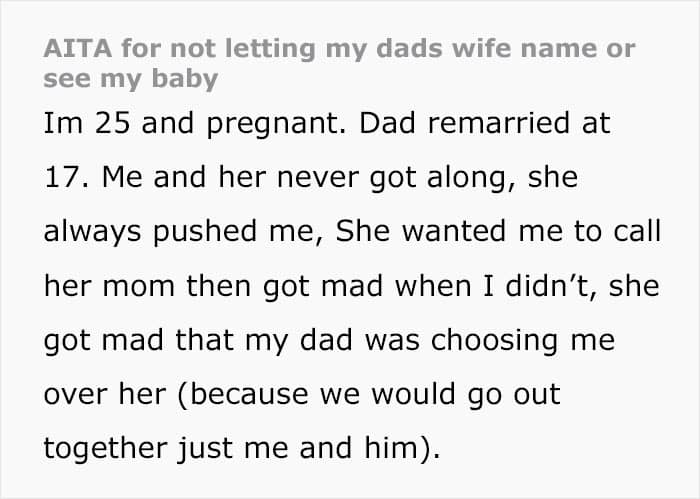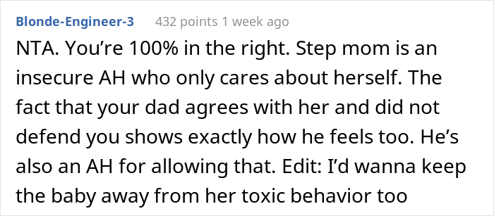 While some of the people closest to the redditor supported her, others, including her father, were on the stepmother’s side. Wanting to get a more objective opinion on what happened, the OP turned to the AITA community for advice. Most redditors were clear about how the author didn’t do anything wrong and that she needed to speak with her father, alone, about the stepmom’s behavior.