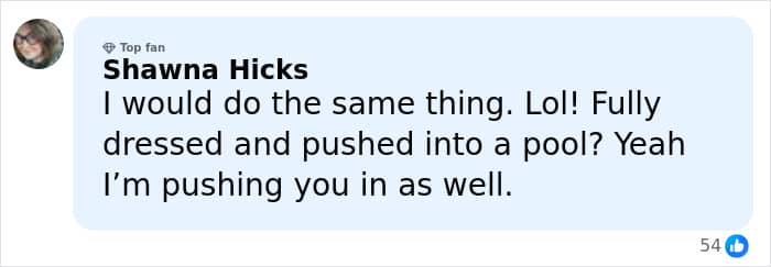Another user commented, “I would do the same thing. Lol! Fully dressed and pushed into a pool? Yeah I’m pushing you in as well.”
