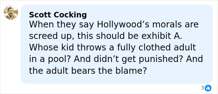 “When they say Hollywood’s morals are screwed up, this should be exhibit A. Whose kid throws a fully clothed adult in a pool? And didn’t get punished? And the adult bears the blame?”