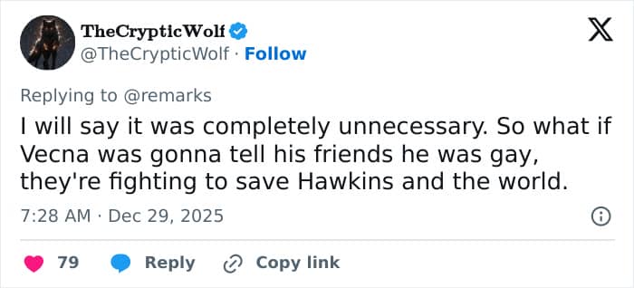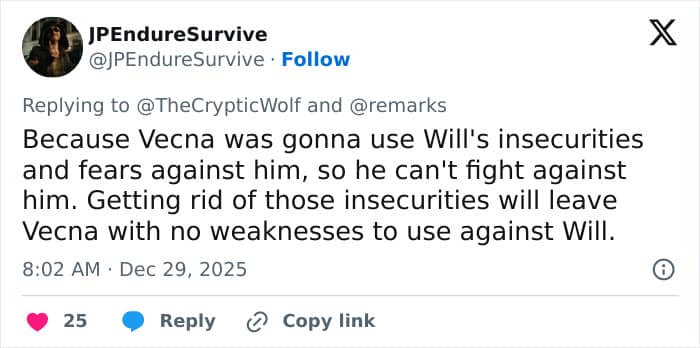 “That’s not what he’s saying,” a user wrote. “He’s saying that this secret shame he was dealing with and fear that if he was exposed — everyone would reject him, is what Vecna used to control him.”