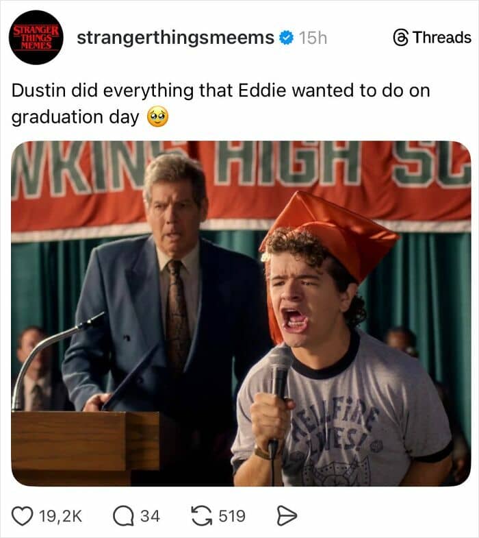 Meanwhile, also speaking about the final Dungeons & Dragons scene, Ross told The Hollywood Reporter that “it’s kind of their last moment of childhood, reliving their childhood one more time. And then one by one, having them leave the basement and Mike shutting the door on it and saying goodbye to childhood and moving on. That was the idea.”