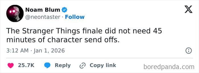 To be clear, the Stranger Things finale didn’t really do anything wildly unexpected or overly original. It really felt like the creators of the show were playing things safe. And that makes sense. After a decade of building the characters in Hawkins and diving into the Upside Down (and beyond), it’s hard to conclude the story in a way that will satisfy everyone. (I keep remembering Lost and Game of Thrones here.)
