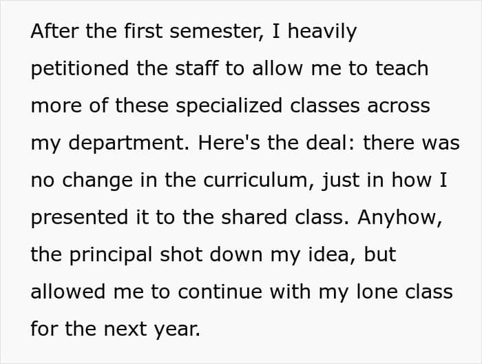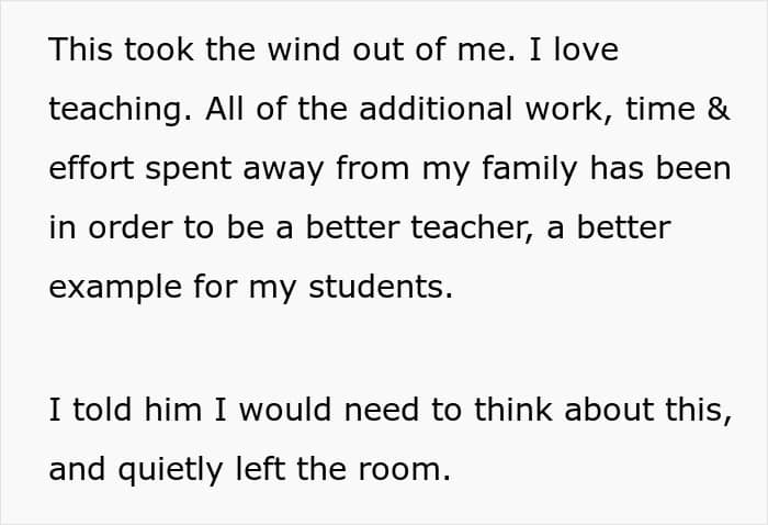 In any other situation, saying “no one cares” to a person passionately defending something is roughly akin to fighting words. At best, this principal was so caught up in their own vision that they forgot what a school and its teachers were actually for. The result is that he is now making decisions that lead to the entire teaching staff applauding when one quits.