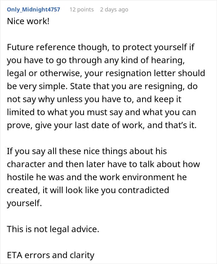 As drastic as it might seem, quitting is often the best choice. Firstly, the “bad manager” isn’t going to magically get better or act nicer. Abuse of power is often a learned behavior, something they do because time and time again, it works out for them. Sometimes cutting one’s losses is enough, but as this story demonstrates, it can also be what gets an even higher up to notice.