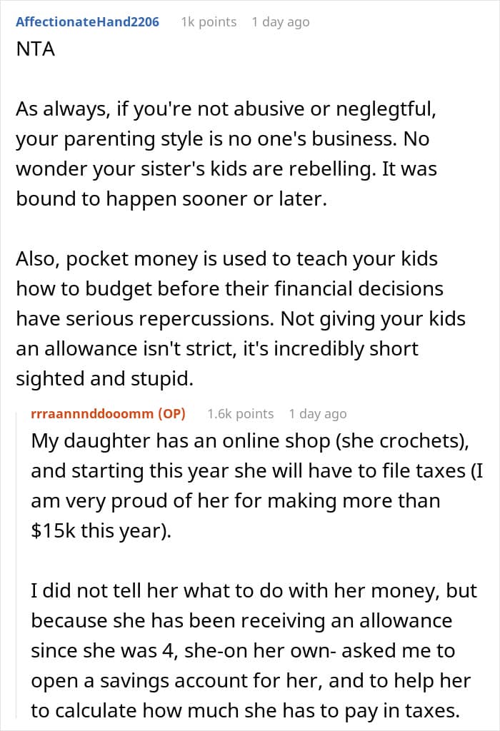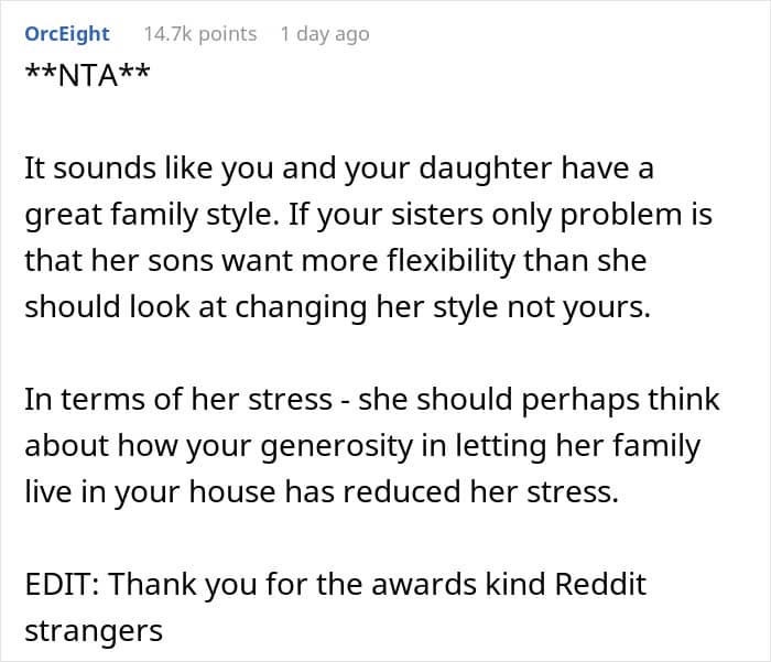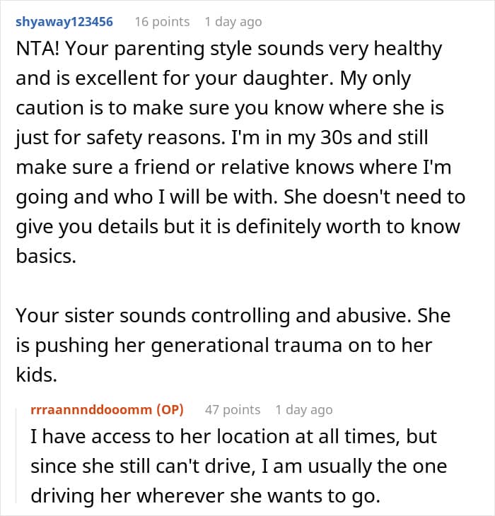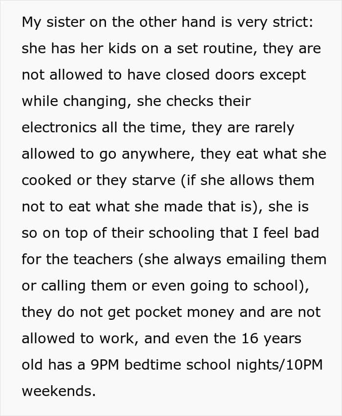 However, the man’s sister didn’t think that the way her brother parents his daughter is suitable because she noticed how her own kids, seeing how their uncle and cousin lives, have started “rebelling”. The author of the post revealed that while he tries to give some space and freedom to his 14-year-old, his sister is overly strict with her kids, monitoring them, constantly checking their schoolwork and not even allowing them to have their doors shut. Seeing how freely her niece lives, the woman said that her brother should do something about this. But the man didn’t budge and instead told her that if she doesn’t like being there, she can move out. Knowing that his response could’ve been too harsh, the man then asked others online what they thought about this situation.