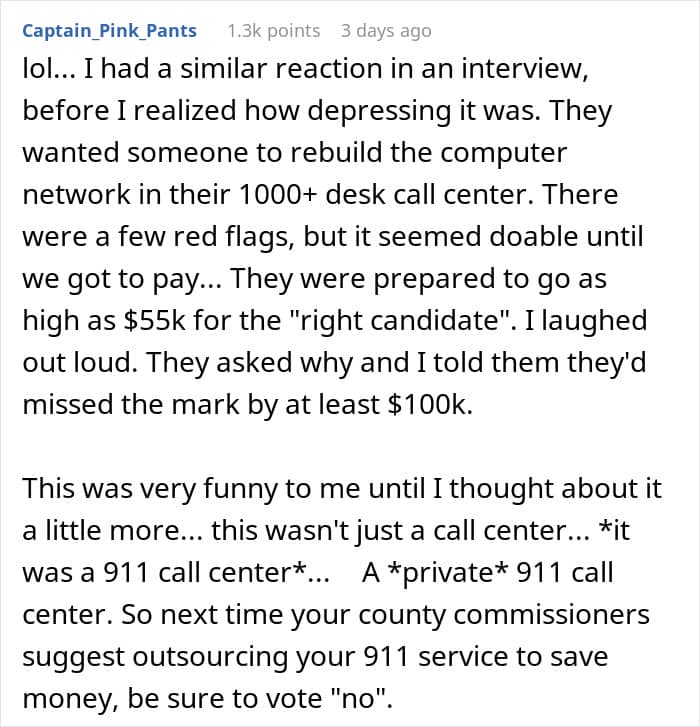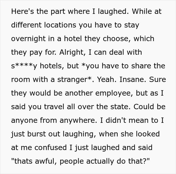 This person couldn’t contain their laughter during a job interview when they heard what the conditions would be. The interviewee later shared their story online, highlighting what absurd expectations some companies have for their employees.