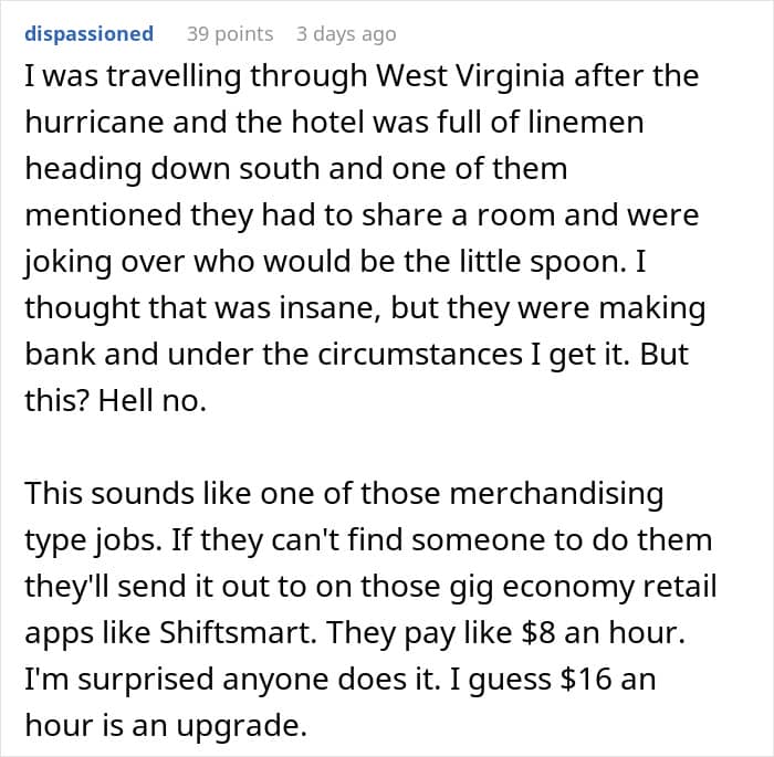 The OP is not the only one finding job hunting hard. Their story is one of many where job seekers stumbled upon some ridiculous job offers. Aside from the no guaranteed work hours and not compensating workers for the commute, the most problematic thing in this story is asking two coworkers to share a hotel room.