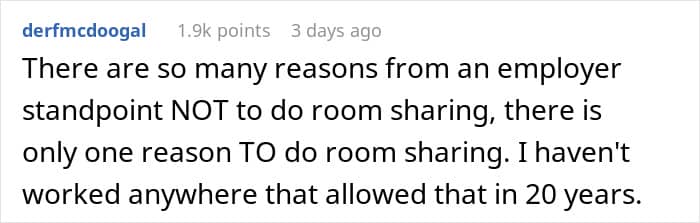 Primarily, this is, of course, a privacy concern. Just like the OP notes, why would someone want to share a room with a stranger? Manager consultant Allison Green wrote about a similar story on her blog. “It doesn’t matter if you’re willing to do it. It doesn’t matter if they’re trying to save money. Assigning people to share beds with colleagues is beyond the pale,” she wrote.