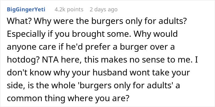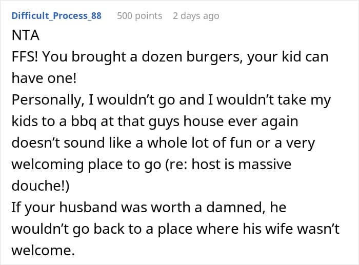 After the party, the OP’s husband received a message that said the next time there is a BBQ party, his wife won’t be invited. Apparently, he didn’t like that she gave a burger to her kid when only adults are allowed them in his home. This is an odd rule, knowing that the children who ate at his party were definitely old enough to be consuming hamburgers.