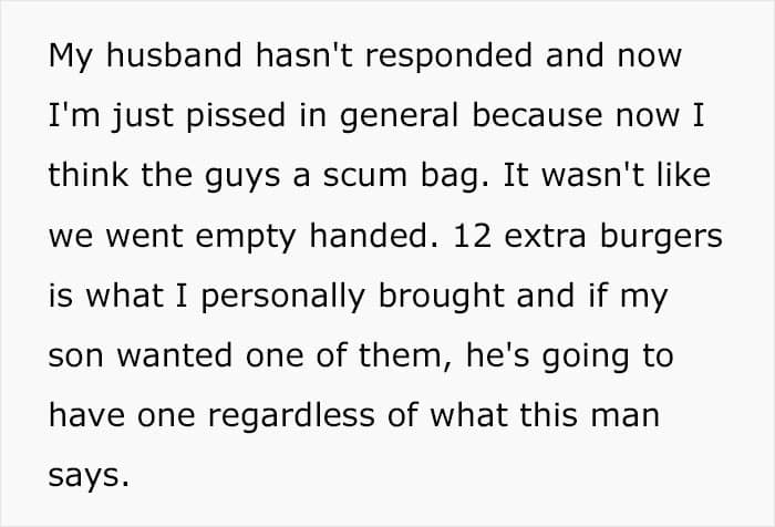 After the party, the husband received a message that said his wife won’t be invited to the BBQ parties anymore because she gave her son the burger