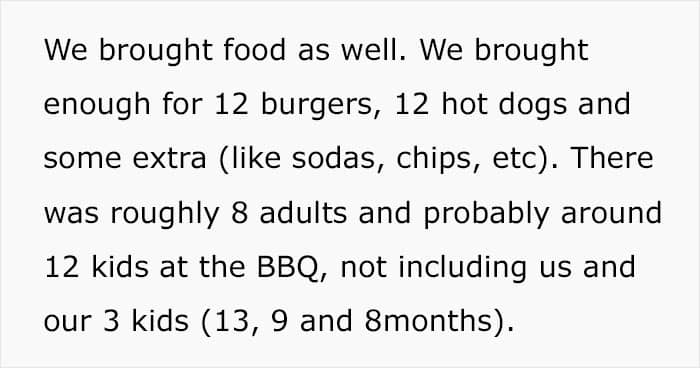 Well, at the party the author’s family attended, it seemed like meat was the main ingredient, as the cook was barbecuing hotdogs and burgers. Interestingly, though the party was hosted by the husband’s friend, the OP’s family were the ones who brought the food. Yet, the main conflict of the party wasn’t related to this.
