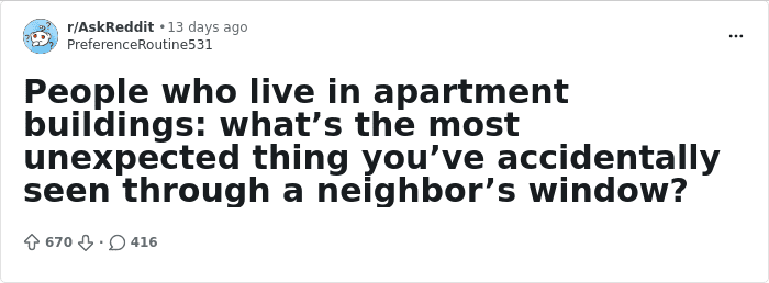 Recently, a thread appeared in the AskReddit community, the author of which, the user u/PreferenceRoutine531, asked netizens: “People who live in apartment buildings: what’s the most unexpected thing you’ve accidentally seen through a neighbor’s window?” It might seem like an unusual question, but the thread has collected many truly interesting and exciting stories.