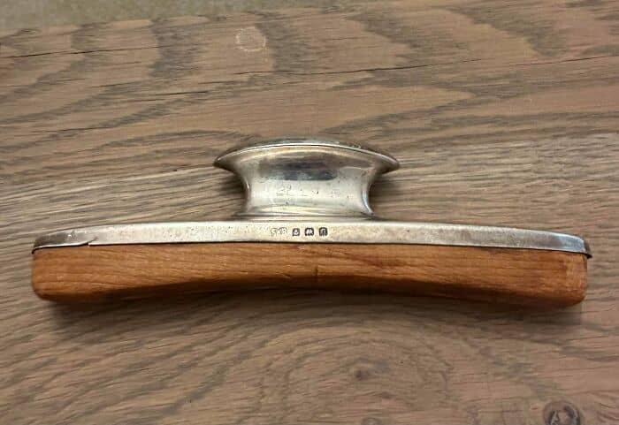 Top half silver, bottom half wood. Around 10-12 cm long, stamped with ‘S*B’, an anchor, lion and horseshoe.