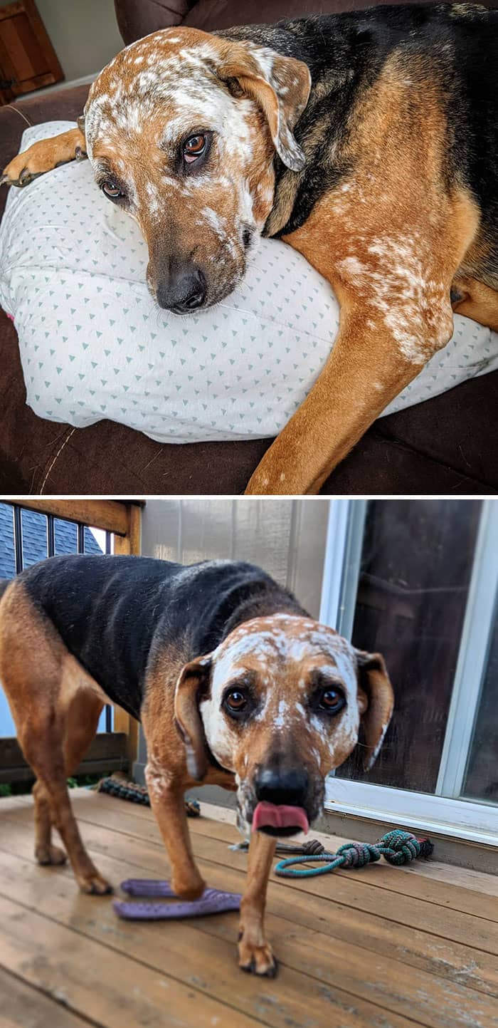 #48 My Dog Buster Has The Skin Condition Vitiligo. It Causes Depigmentation Of The Skin (And Fur). It’s Been 9 Months Between These Pictures