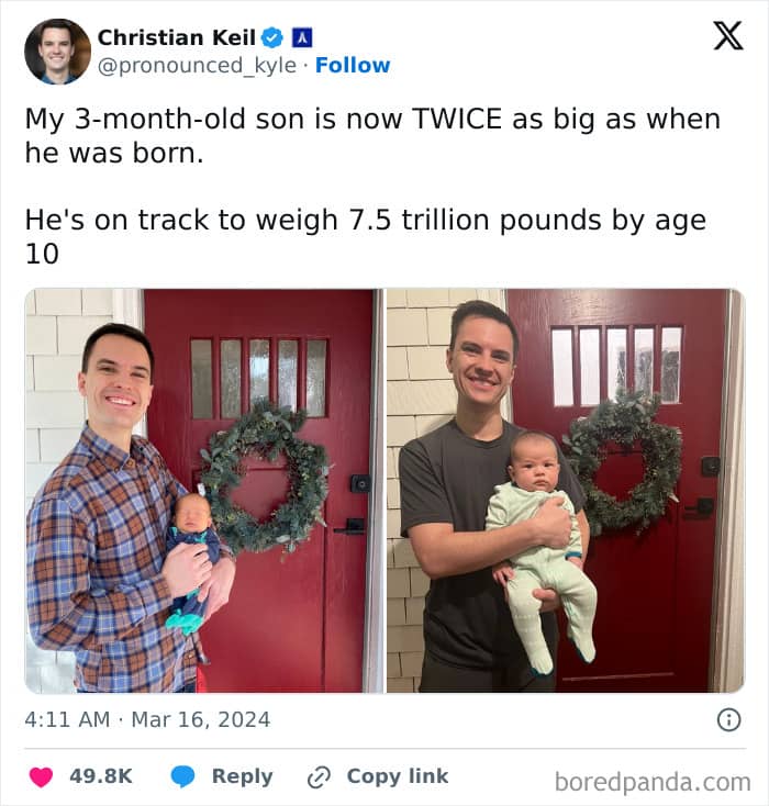shelmich: If his weight doubles every 3 months, then by the time he hits 10, he’ll have doubled 40 times. So if he’s 7.5 trillion when he’s 10, then we can solve for his birth weight in the following equation: 7.5 trillion lbs = x * 240 This gives x = 6.8 lbs, a very reasonable birth weight.