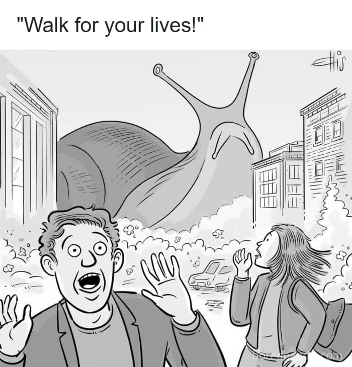 innnerness: If we take it literally, assuming the snail is roughly the height of a five-story building (say, 15 meters tall), that’s about 1,500 times larger than a typical garden snail (~1 cm tall). Speed scales roughly with the square root of linear size if muscle power and proportions stay the same. So: Average snail speed: ~0.03 mph (0.048 km/h). Square root of 1,500 ≈ 39. 0.03 mph × 39 ≈ 1.2 mph (about 2 km/h So, this Godzilla-sized snail would crawl at a slow walking pace, fast enough to make “Walk for your lives!” actually sound like decent advice.