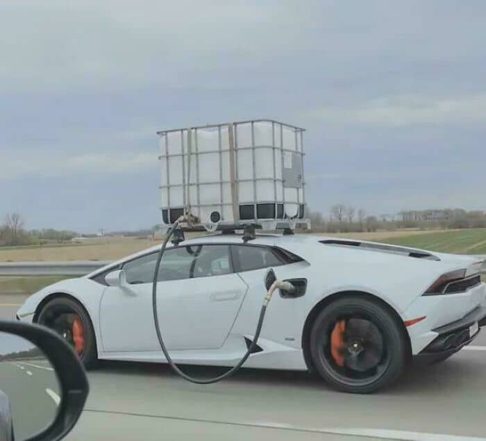 somehugefrigginguy: I’m not a car guy, but best I can tell that is a 2019 Lamborghini Huracan which gets about 15 miles per gallon. The tank on top looks like a 275 gallon IBC tank, so ignoring aerodynamic effects it would add about 4,125 miles of range. That tank mounted in that orientation adds approximately 13 ft² of frontal cross section plus parasite drag so at highway speeds this could reduce fuel economy by as much as 50%. So if we assume a fuel economy of 7.5 mpg, that tank would add 2,062 miles of range.