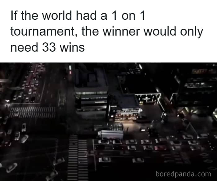 wayoverpaid: This assumes a single elimination, best of one tournament. Say something like rock paper scissors or a coin flip. You need one round for the finals. So one game for the finals. Semifinals has four people, quarter finals has eight people. Each round cuts the field in half. The winner only needs to win one round from that game. With 33 rounds, you get 233 people. That’s 8,589,934,592. World population is under 8.3 billion. So the winner MIGHT get a bye in the first round, and only have 32 games. But 33 games guarantees the win.