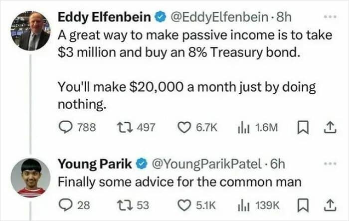 Deep-Thought4242: The structure is accurate, the details are wrong. Treasury bonds don’t literally pay you monthly. I think those pay twice a year. And the current yields are 4-5% not 8%. But that means you can buy $3 M in T-Bonds and then twice a year, you’ll get about 67,000 to spend. ETA: most people with $3M+ portfolios would consider this an unwise use of it, though it is very low risk.