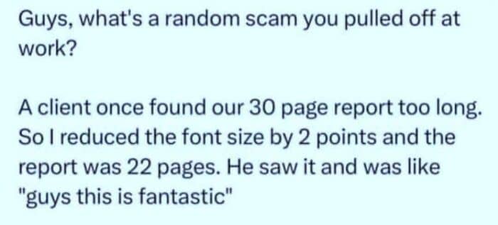 With the same sequence of characters and font, you can assume that the number of pages scales with the inverse square of the font size, since characters per row and rows per page both scale inversely with font size, with a scaling factor K depending on frequency of character use and the font character lengths and kerning. Set F as the original font size, and F-2 as the new font size. K / F2 is the number of characters per page in the original, so with 30 pages we have 30 x K / F2 characters. By that same logic, 22 x K / (F-2)2 is the same number of characters. Thus: 30 x K / F2 = 22 x K / (F-2)2 22 x F2 = 30 x (F-2)2 22F2 = 30F2 – 120F + 120 8F2 – 120F +120 = 0 F2 – 15F + 15 = 0 F = (15 +/- sqrt(225 – 60))/2 F = ~1 or ~14, meaning F-2 = -1 or 12 The original document was font size 14, and it was shrunk to font size 12.