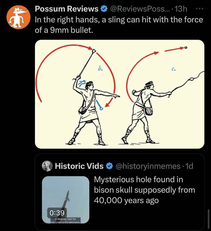 FriendlySceptic: 9mm Bullet: Mass: ~8 grams (124 grains) Speed: ~350 m/s (varies by load) Kinetic energy: around 490–600 joules Sling projectile (lead or stone): Mass: ~50–100 grams Speed: ~30–60 m/s in skilled hands (some reconstructions reach ~70–100 m/s) Kinetic energy: around 200–500 joules, sometimes higher. Force of the hit is comparable but the damage caused isn’t the same. A bullet’s velocity is much higher, so it causes more penetration and shock trauma, while a slingstone delivers more blunt-force trauma and can still break bones. Sort of like getting poked with a spear vs hit with a mace. Same force in the strike but very different results even though both are potentially lethal.